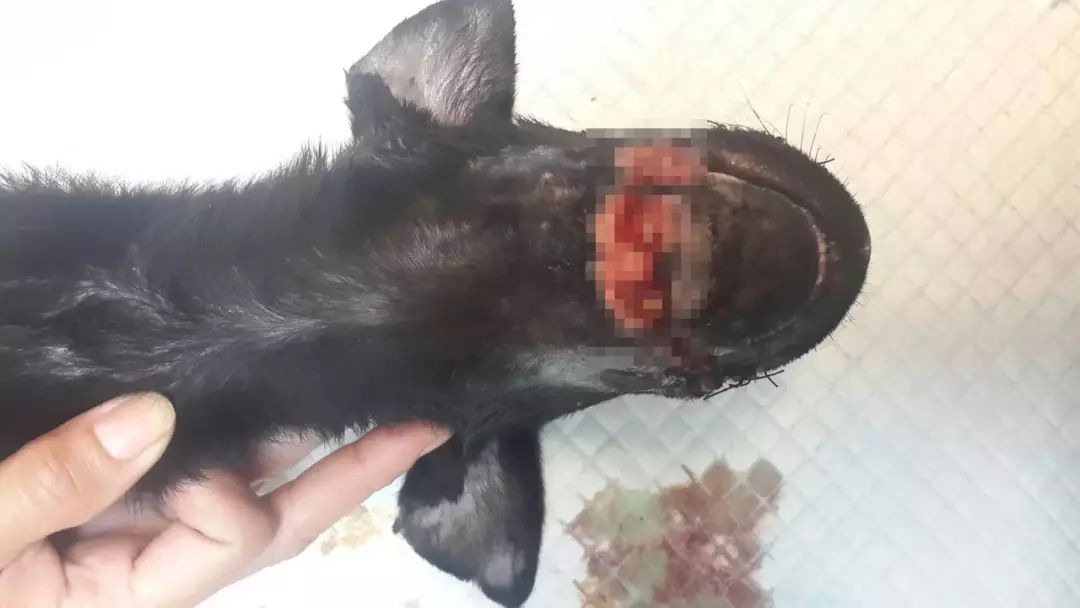 好心人立刻將它送往了醫院,醫生檢查后發現,它的傷勢比表面上更嚴重,因為嘴被長期緊緊的綁住,無法張開,導致傷口潰爛發炎,不斷的流出膿血,整個嘴腫脹不已。
