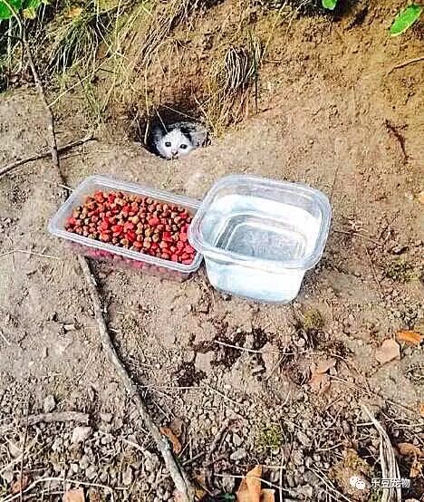 于是他用盒子裝了吃的,還給它準備了水,放在洞口讓它出來吃,他等了一會兒,這只貓也一直沒有出來吃,